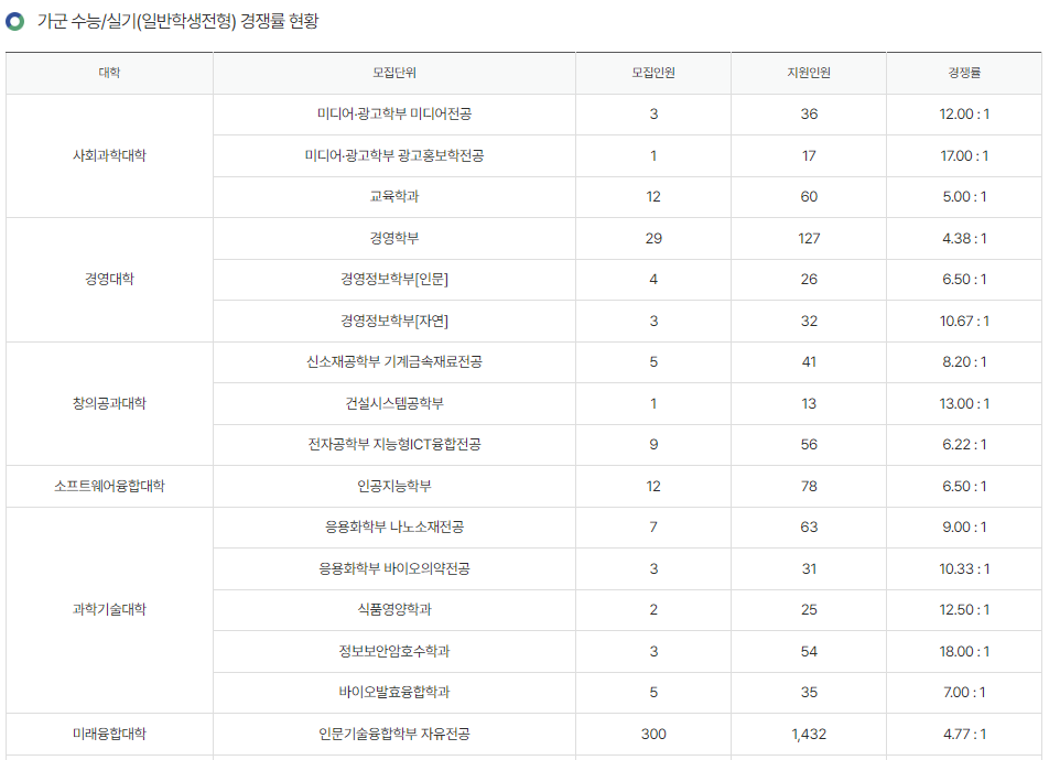 확실히 미래융합전공은 모집인원이 많은 많큼 지원도 많이 했지만 경쟁률은 4:1 정도 됩니다.