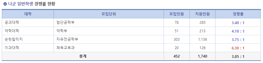 나군 : 모집 452명 / 지원 1,740명 - 3.85:1