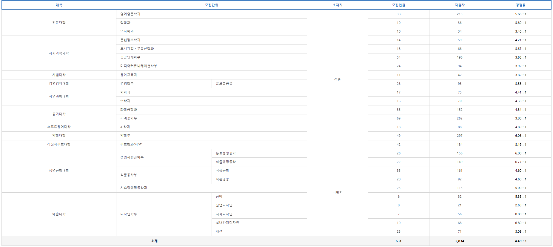 가군 : 모집 631명 / 지원 2,834명 - 4.49:1