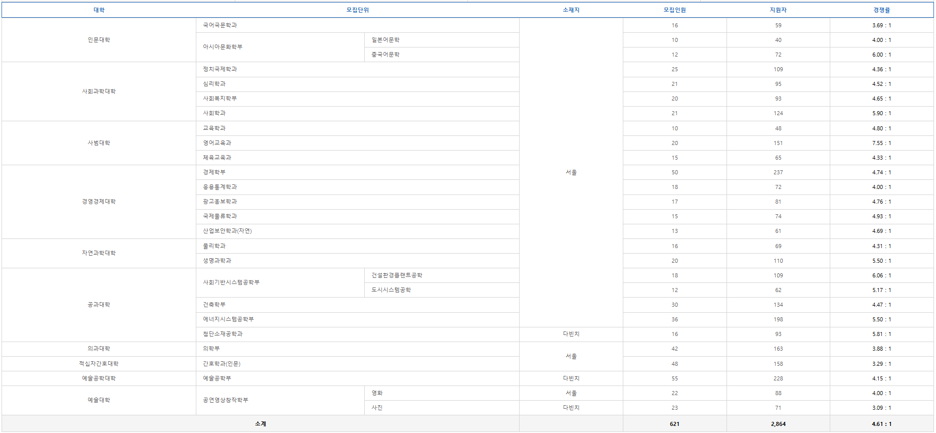 나군 : 모집 621명 / 지원 2,864명 - 4.61:1