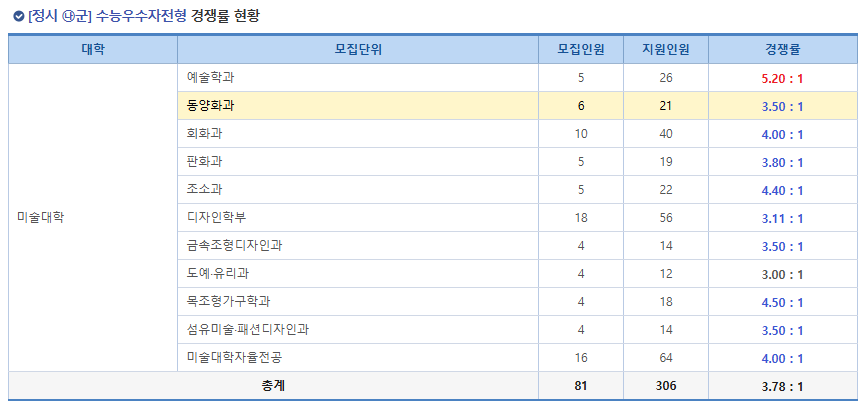 그러면 미술대학에서도 경쟁률이 어디가 높은지 봐볼까요.